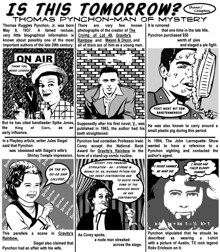 Some early reviews of Pynchon’s new book, most of which applaud its comic elements, though there have been some grumbles (which at times have verged on the pissy) about it lacking the substance of its ancestors. In the next few days, I’m going to start reading and blogging it, probably at the rate of about 25 pages a day (about 2 weeks in all). I do this purely for my own edification, but company, in such surroundings, is always a pleasant surprise.
