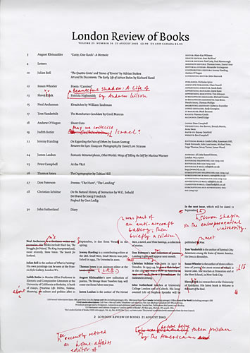 Nearly 600 boxes (or 275 linear feet’s worth) of material from the 30 years of the London Review of Books has gone to the archives of the University of Texas, in Austin. The files contain correspondence (between editorial staff, contributors and readers), typescript submissions and page proofs, complete with annotations. There are also pieces (and here my heart skips a beat) that failed to make it to publication, on which are written comments such as ‘not urgent’, ‘not this week’ or worst of all, ‘Killed’. The only frustrating thing about the scans included in the article is that the annotations on the pages are (no doubt deliberately) not quite legible. More here.