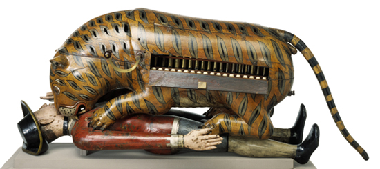 ‘Tippoo’s Tiger’ is a life-size tiger of carved and painted wood, seen in the act of devouring a prostrate man in the costume of the 1790s. Concealed in the bodywork is a mechanical pipe-organ with several parts, all operated simultaneously by a crank-handle emerging from the tiger’s shoulder. Inside the tiger and the man are weighted bellows with pipes attached. Turning the handle pumps the bellows and controls the air-flow to simulate the growls of the tiger and cries of the victim.